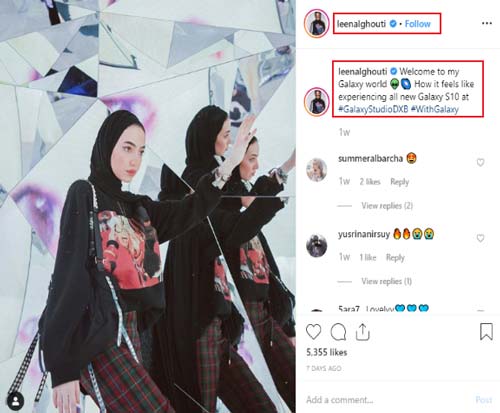 وكمثال على ذلك، الصورة بالأسفل لمنشور لأحد المؤثرين العرب في مجال الأزياء، وهو عبارة عن إعلان لهاتف سامسونج جالاكسي S10 الذي صدر مؤخراً.